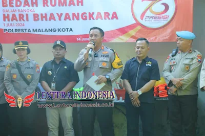 LenteraIndonesia.co.id || KOTA MALANG - Dalam rangka menyambut Hari Bhayangkara ke-78 tahun 2024, Polresta Malang Kota mengadakan kegiatan bedah rumah milik Sumarni (57) di Jl Raya Candi 2, Kelurahan Karangbesuki, Kecamatan Sukun dan Ngateno (71) warga Jl Binor III Kelurahan Bunul Rejo Kecamatan Blimbing